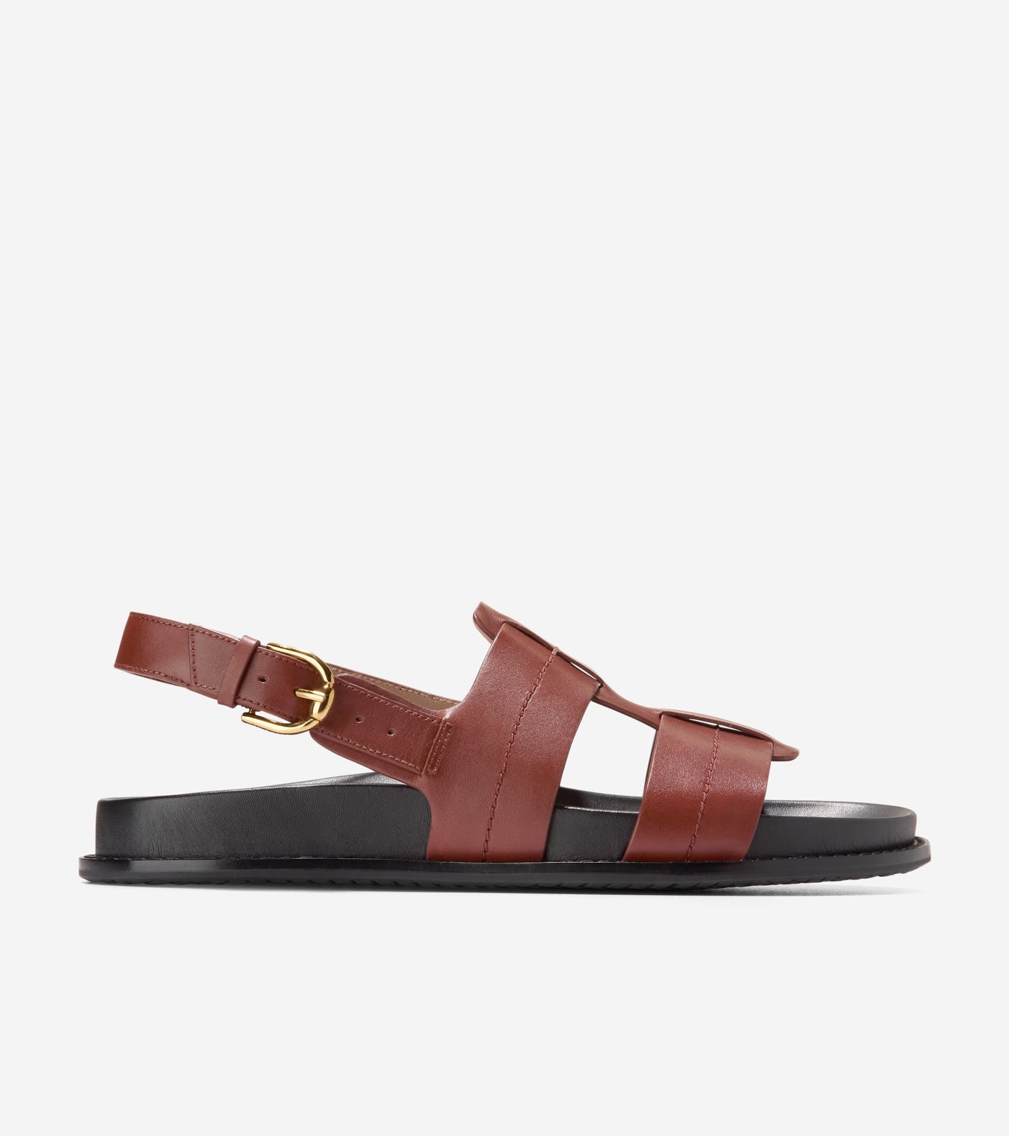 - Two-band leather upper in Dark Cuoio; adjustable buckle